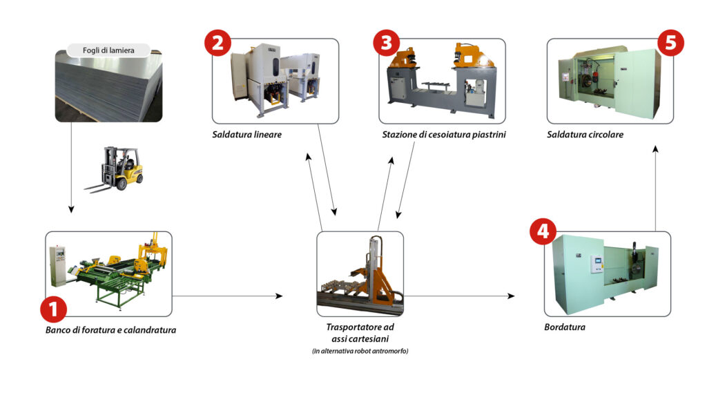 We specialize in manufacturing all the machines that make up a complete tank production line or “island.” Our deep expertise and proven know-how in the development of tank production systems enables us to manage every stage of the process — from initial design to the construction of machines that transform sheet metal stacks into fully assembled tanks through precise processing and metal welding operations.